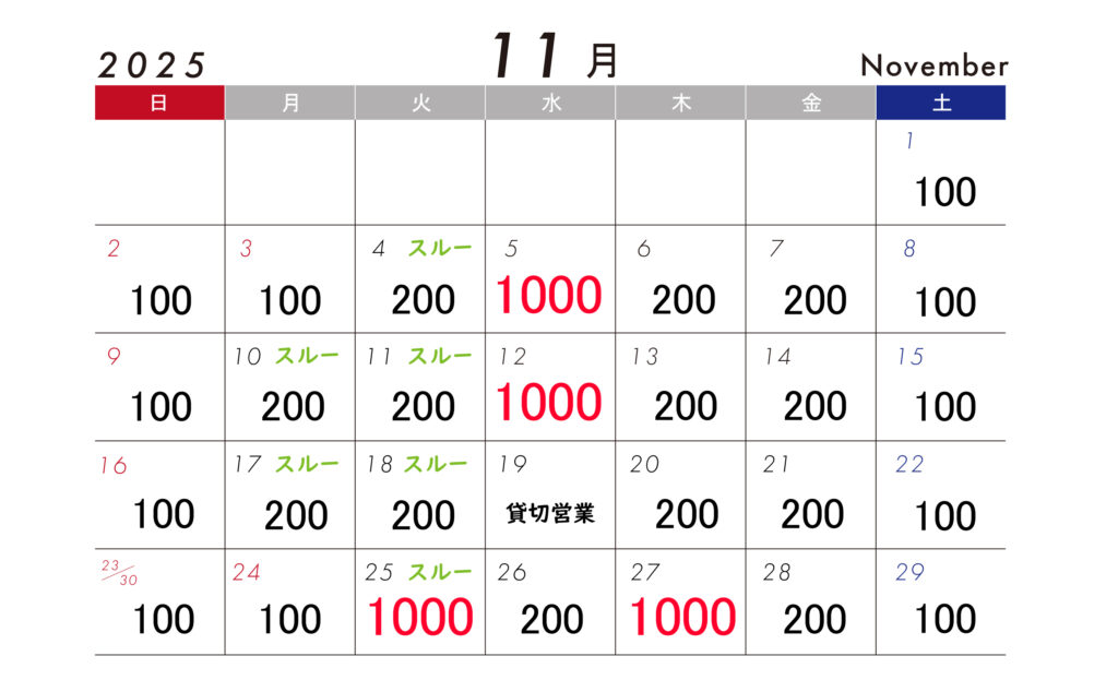 2025年11月の対象日は、5(水)、12(水)、25(火)、27(水)