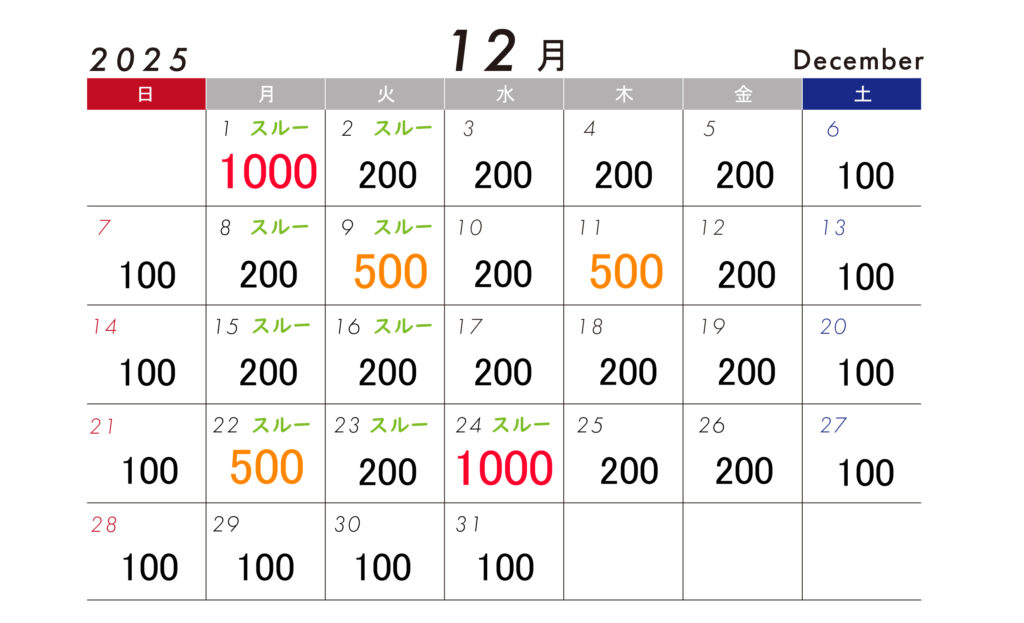 2025年12月の対象日は、1(月)、24(水)来場で【1000P】ゲット